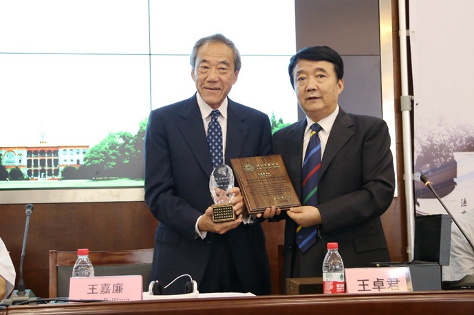 大會宣讀和展示了中國社會科學(xué)院法學(xué)研究所、西南政法大學(xué)等單位發(fā)來的賀信、賀辭。會議召開前夕,國內(nèi)100余所教學(xué)、科研單位和法院、檢察院、律師事務(wù)所或是發(fā)來賀信,或是帶來禮品,以表達對東吳法學(xué)百年的祝愿。中央政法委副秘書長徐顯明教授的妙對“天地正氣一準乎法,古今完人全在于學(xué)”賀聯(lián),更是準確地詮釋了東吳校訓(xùn)的深厚內(nèi)涵。同時,為表達對東吳老校友王健先生的哲嗣王嘉廉捐資千萬美金資助法學(xué)院發(fā)展的業(yè)績,蘇州大學(xué)向王嘉廉先生授予“特別貢獻紀念”證書。王書記宣讀了蘇州大學(xué)給王先生的致敬辭:“嘉廉先生,業(yè)界精英;踵繼父志,孝敬雙親。巨資興學(xué),恩澤永存;蘇大感佩,校史留名”。王嘉廉先生欣然接受了獎杯與紀念證書,并作了熱情洋溢的發(fā)言。在致辭中,王先生談到了王健先生在東吳法學(xué)院所接受的公平正義理念教育,闡述了其體會父親感恩母校的愿望而資助法學(xué)院建設(shè)的初衷,對蘇州大學(xué)王健法學(xué)院近年來所取得的飛速發(fā)展表示欣慰。