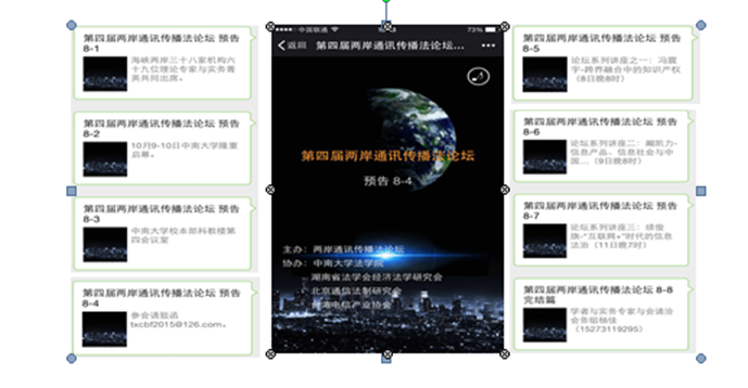 論壇的第四個特色在于,最新通訊傳播手段的充分運用,實現(xiàn)高品質(zhì)有效的會議信息傳播。本次論壇開幕前即10月1日-8日每天21時,八天分八期透過微信平臺以精致的文案對會議七單元及三環(huán)節(jié)進行了逐一推送,對所有與會專家一一進行了圖文并茂的介紹!拔⑿怕(lián)播預告”模式創(chuàng)造會議宣傳之先例,吸引了海峽兩岸各行各界廣泛關注。會議召開期間,科教樓三臺顯示屏同期播放中南大學、中南大學法學院和會議盛況與專家介紹,用足了現(xiàn)場傳播手段,大大提升了宣傳效果。