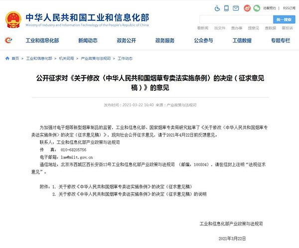 3月22日,據工信部網站消息,為加強對電子煙等新型煙草制品的監(jiān)管,工業(yè)和信息化部、國家煙草專賣局研究起草了《關于修改〈中華人民共和國煙草專賣法實施條例〉的決定(征求意見稿)》,現(xiàn)向社會公開征求意見。