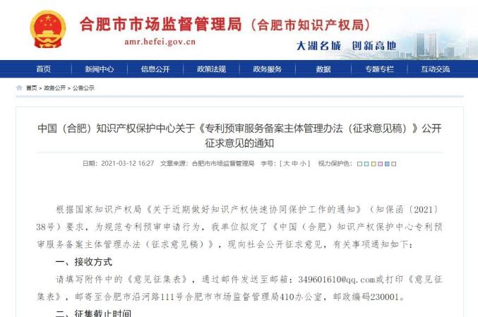 近日,合肥市知識產(chǎn)權(quán)局出臺了《中國(合肥)知識產(chǎn)權(quán)保護(hù)中心專利預(yù)審服務(wù)備案主體管理辦法(征求意見稿)》,并向社會公開征求意見建議。